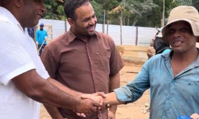 Prefeito Vilmar Kalunga, ao lado do vereador Moisés Paulino (ao centro) e operador de maquinário na obra do Instituto Federal do Estado de Goiás, em Cavalcante...