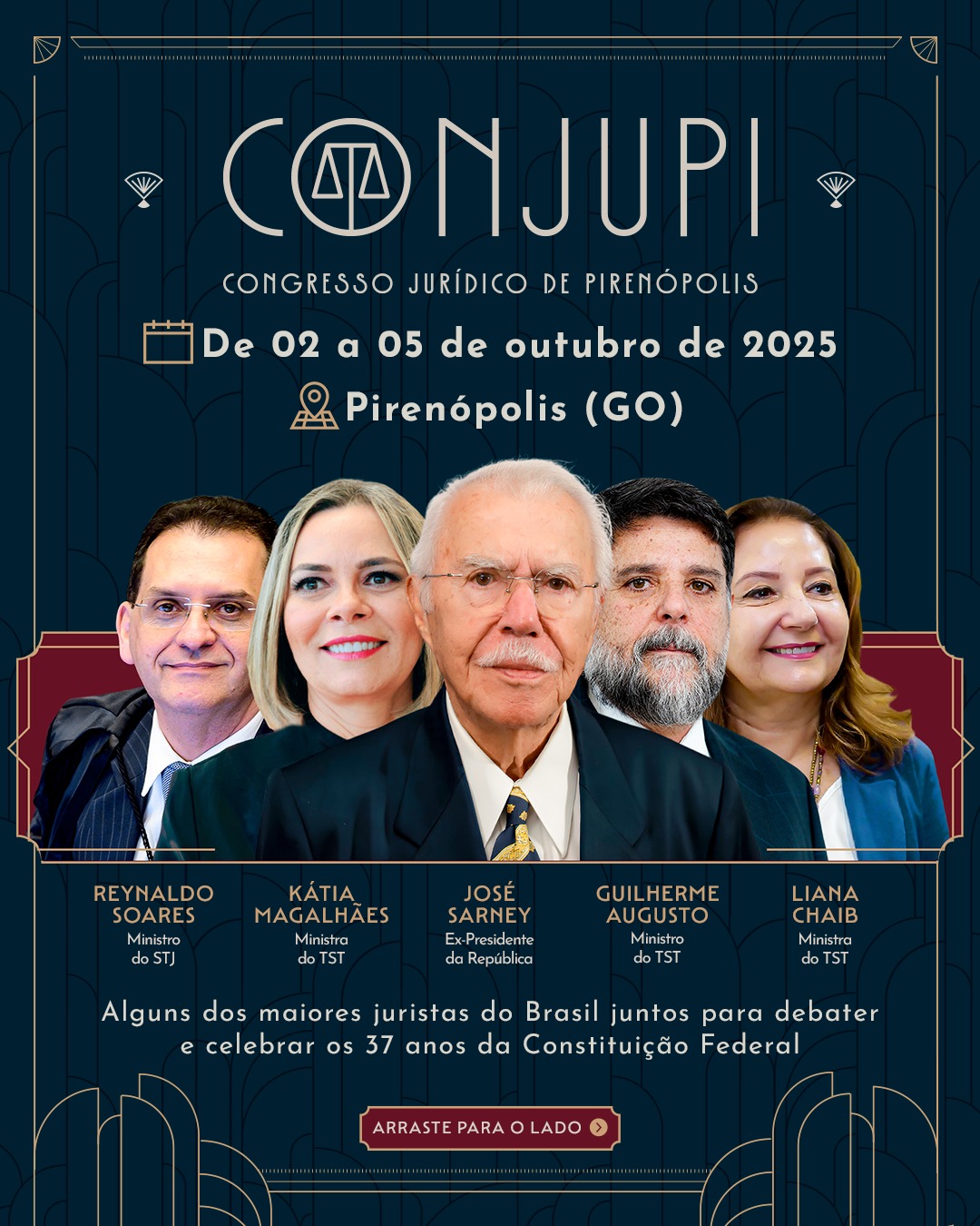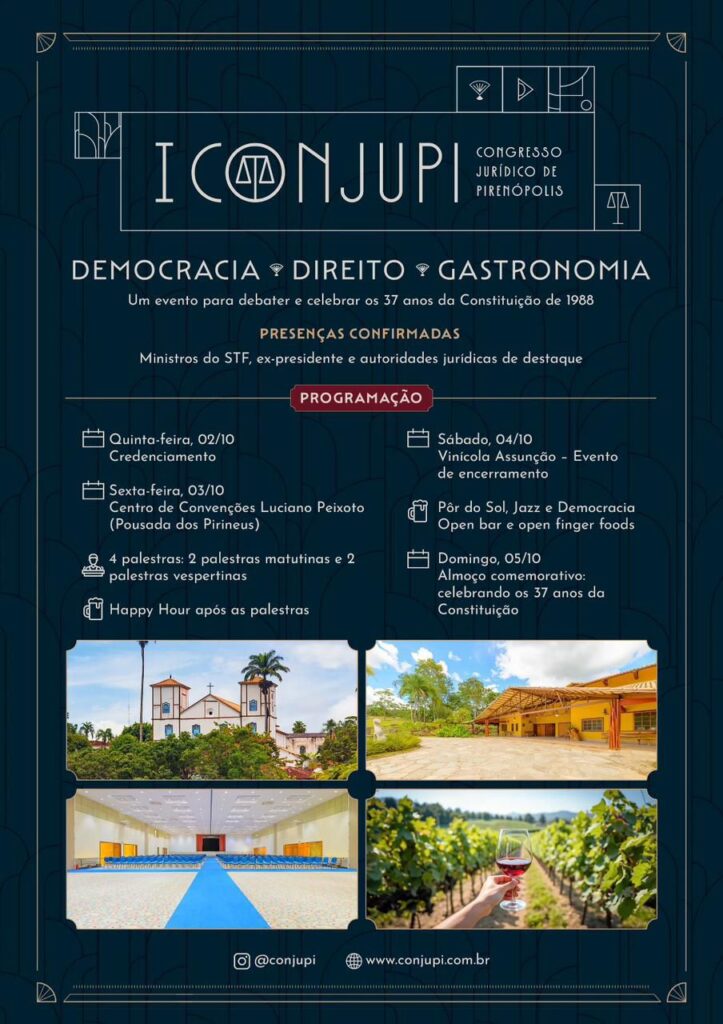 De 2 a 5 de outubro de 2025, a histórica cidade de Pirenópolis (GO) será palco do I Congresso Jurídico de Pirenópolis (CONJUPI), evento que comemora os 37 anos da Constituição Federal de 1988 e que vai reunir grandes nomes do cenário jurídico nacional em um encontro que une reflexão, conhecimento, cultura e gastronomia