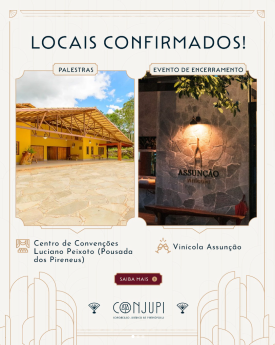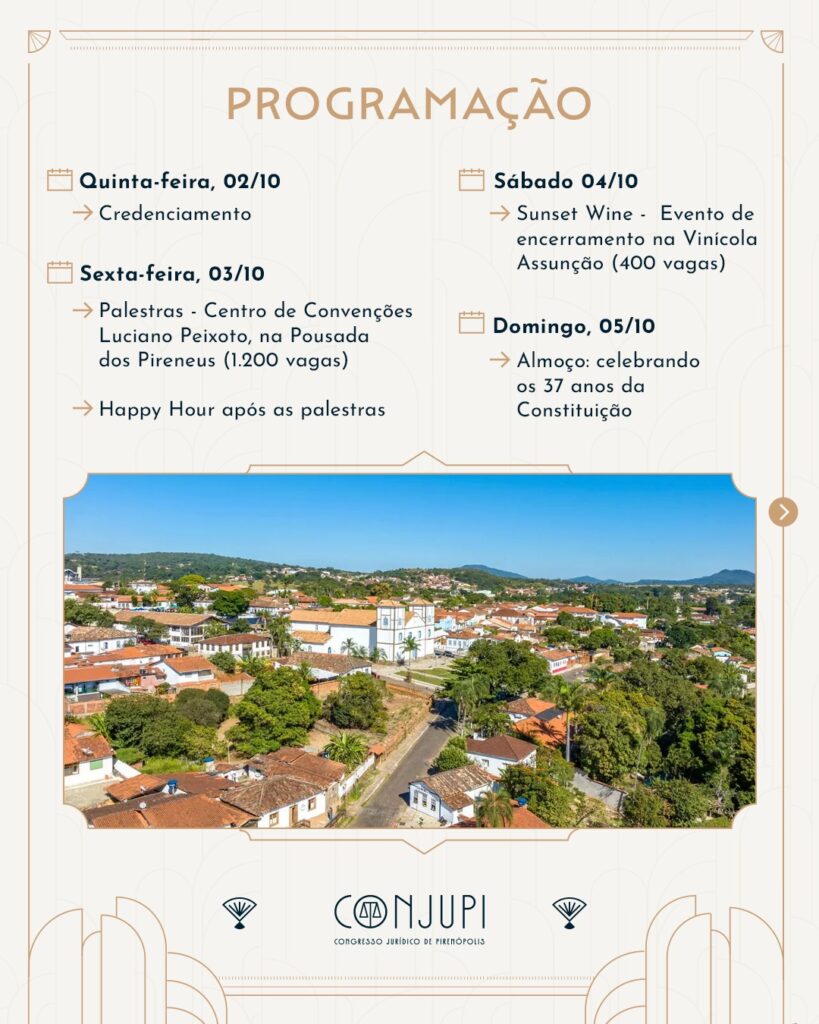 Mais do que um congresso jurídico, o CONJUPI é uma experiência completa, que conecta reflexão acadêmica, networking e a vivência cultural e gastronômica de Pirenópolis, destacam os organizadores.
