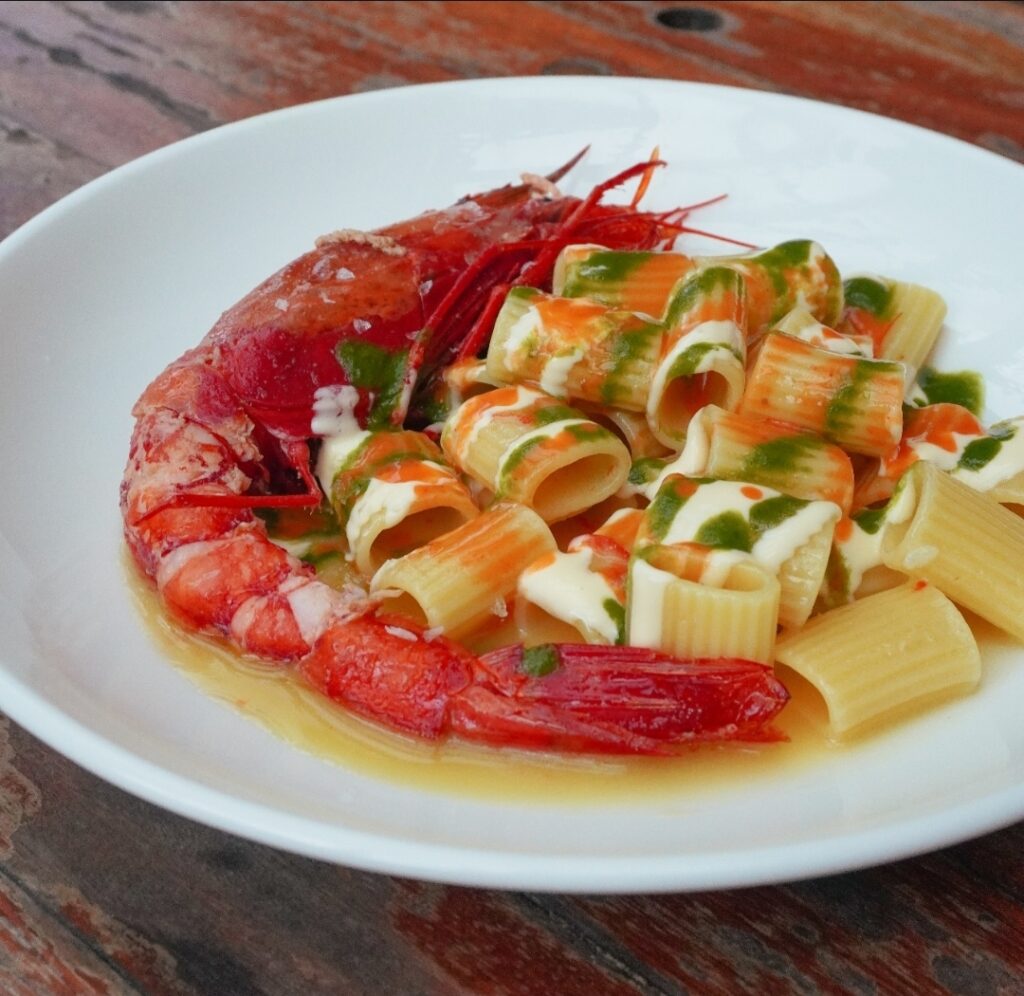 Para o primi, a mezza maniche com camarão carabineiro (R$ 170) combina alho, azeite e peperoncino a uma finalização com bisque e fonduta de pecorino, enquanto a versão com camarão rosa mantém a mesma base técnica.
