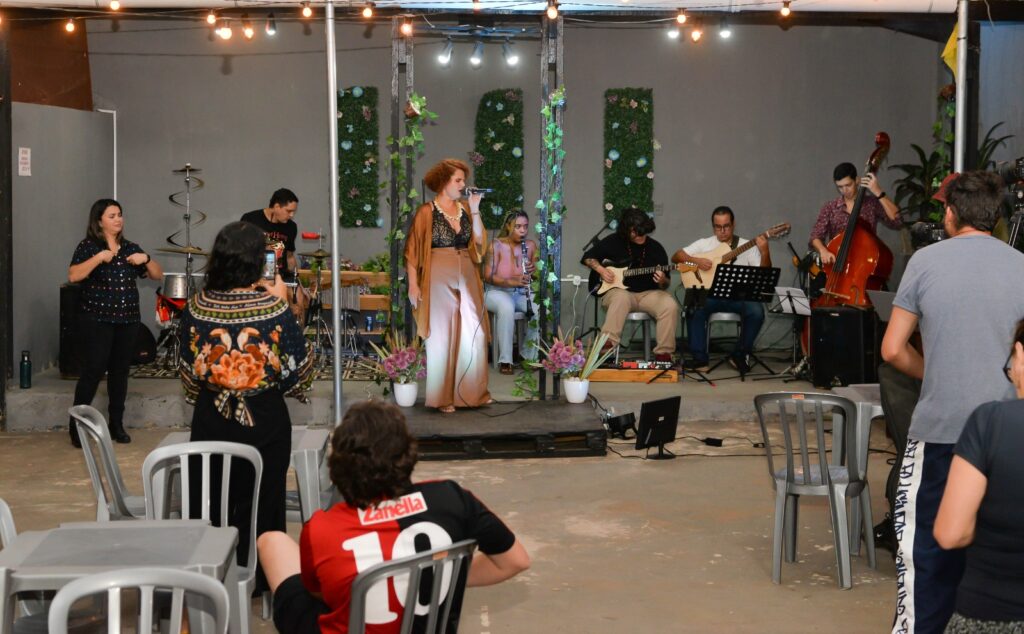 No palco, as artistas Regina Jardim, Rainy Ághata e Ingrid Lobo conduzem o público por uma interpretação sensível e contemporânea da música nacional, reforçando o protagonismo feminino e a força das mulheres no cenário cultural goiano.