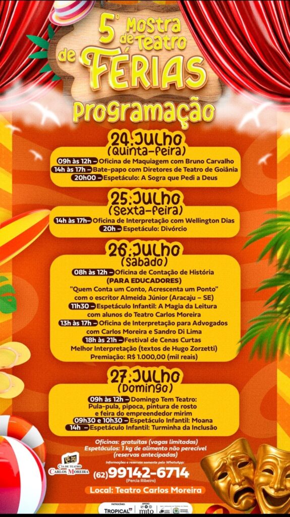Com atrações diversificadas e gratuitas para todas as idades, a 5ª Mostra de Férias do Teatro Carlos Moreira será realizada de 24 a 27 de julho, na sede da companhia, localizada na Rua 8 (Rua do Lazer), no Centro de Goiânia.