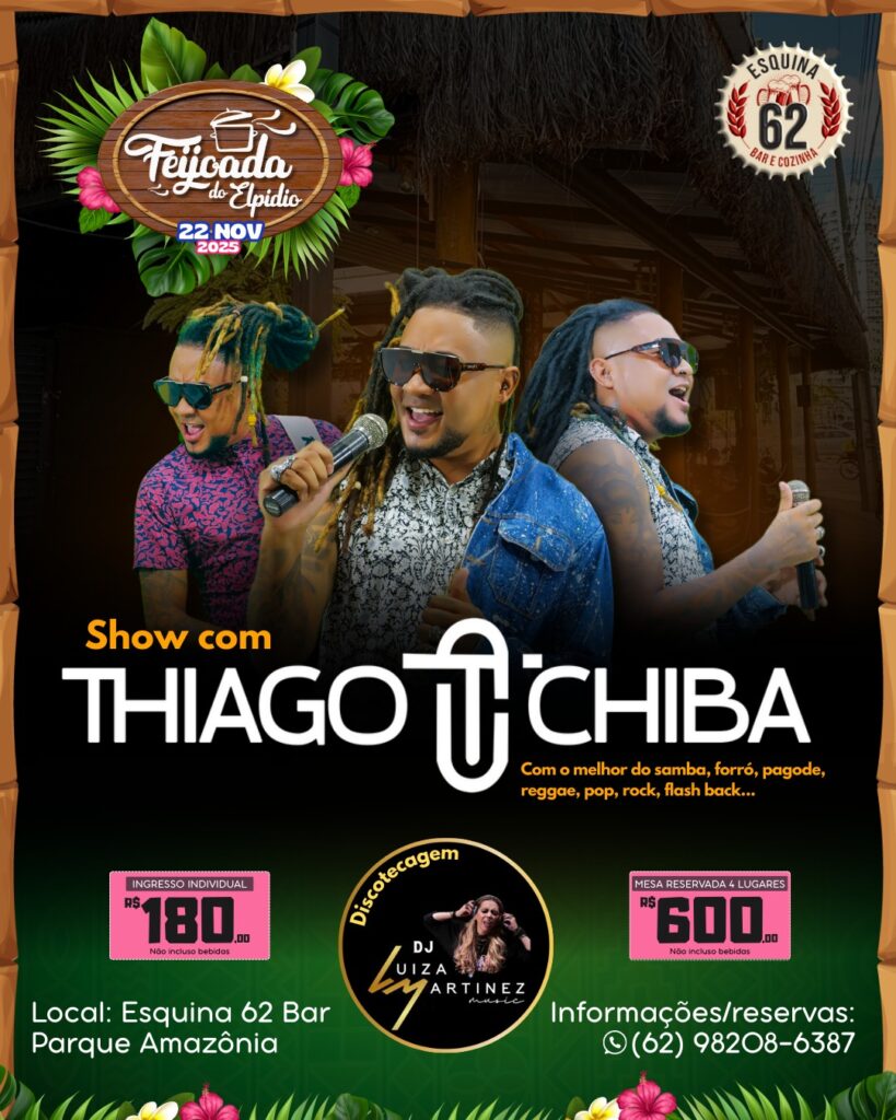 🎤 Thiago ChibaCantor e compositor com 18 anos de carreira, Chiba é reconhecido por sua mistura única de pop e reggae com ritmos brasileiros, criando um som leve e envolvente que transmite positividade e eleva a autoestima.