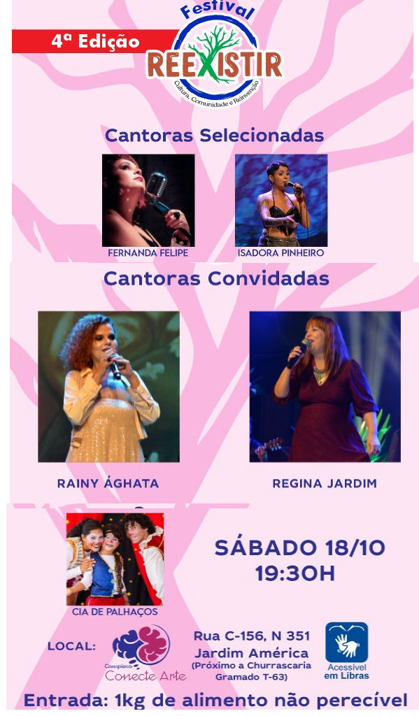 O Projeto REEXISTIR chega à sua quarta edição neste sábado, 18 de outubro, no Complexo Conecte Arte, localizado no bairro Jardim América, em Goiânia (GO). O evento vem se firmando como um dos mais importantes movimentos de valorização da cultura local, promovendo arte, diversidade e resistência cultural por meio de múltiplas expressões artísticas.