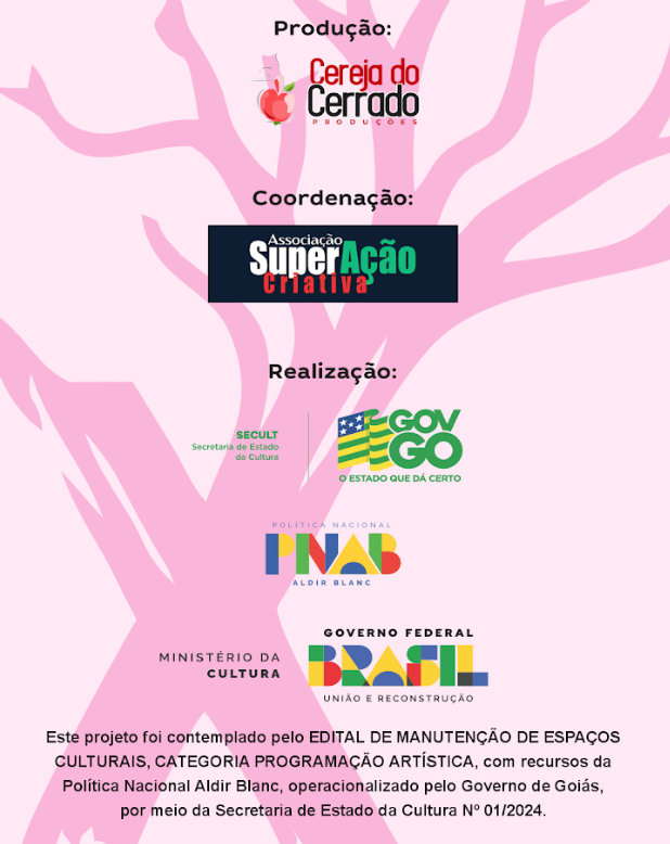 O Projeto REEXISTIR é uma realização da Associação SuperAção Criativa, com produção executiva da empresa Cereja do Cerrado Produções. A iniciativa foi contemplada pelo Edital de Pontos de Cultura – GO, com recursos da Política Nacional Aldir Blanc, por meio da Secretaria de Estado da Cultura de Goiás (Edital nº 018/2024).