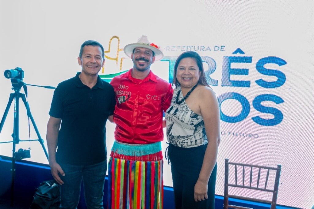 Agnaldo de Oliveira Miguel (Secretário de Turismo de Três Ranchos), Cássio Alves (Capitão do Terno Catupé Cacunda Nossa Senhora do Rosário de Três Ranchos) e Clícia Feitosa (Secretária Municipal de Cultura de Três Ranchos)