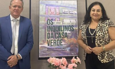 Bruno Rocha e a servidora do TJ Simone Costa. Lançamento da edição atualizada do livro “Os Inquilinos da Casa Verde – Governos de Goiás de Pedro...