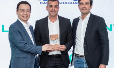 OCEO do grupo Odilon Santos, Odilon Santos Neto, recebeu das mãos do presidente da BYD Brasil, Tyler Li (à esquerda) e do diretor comercial da fabricante, Bruno...