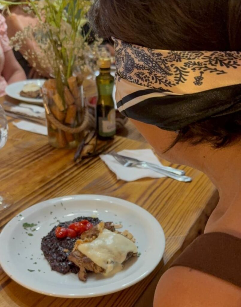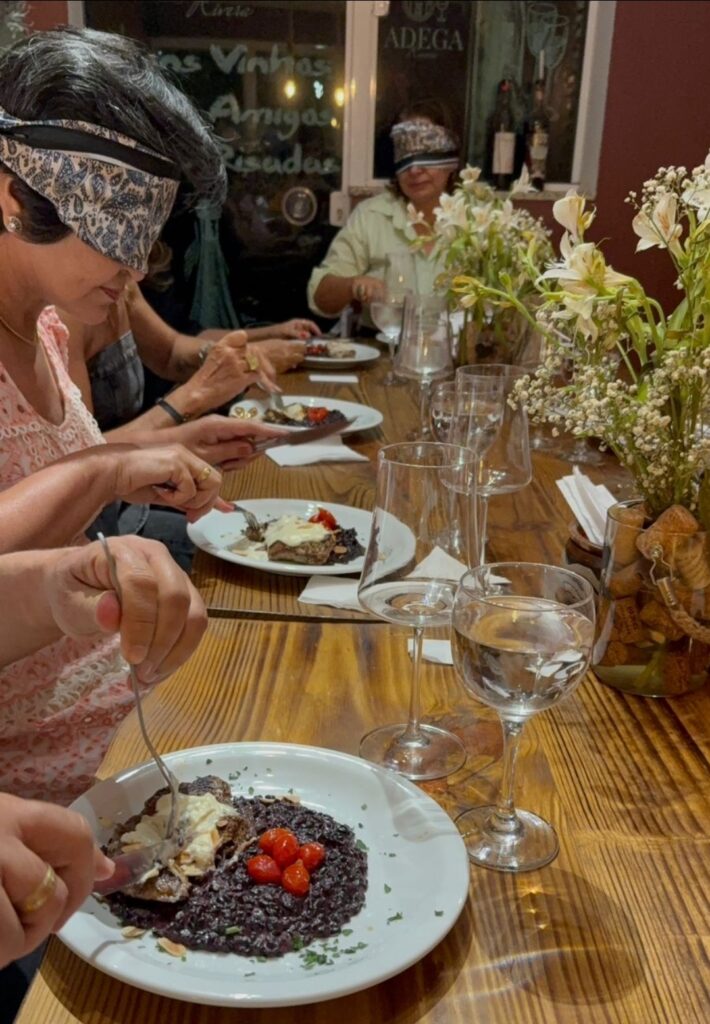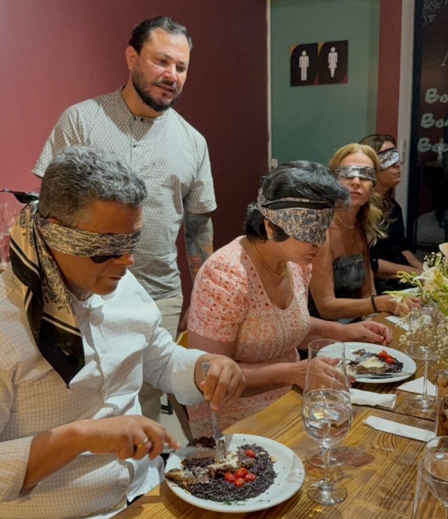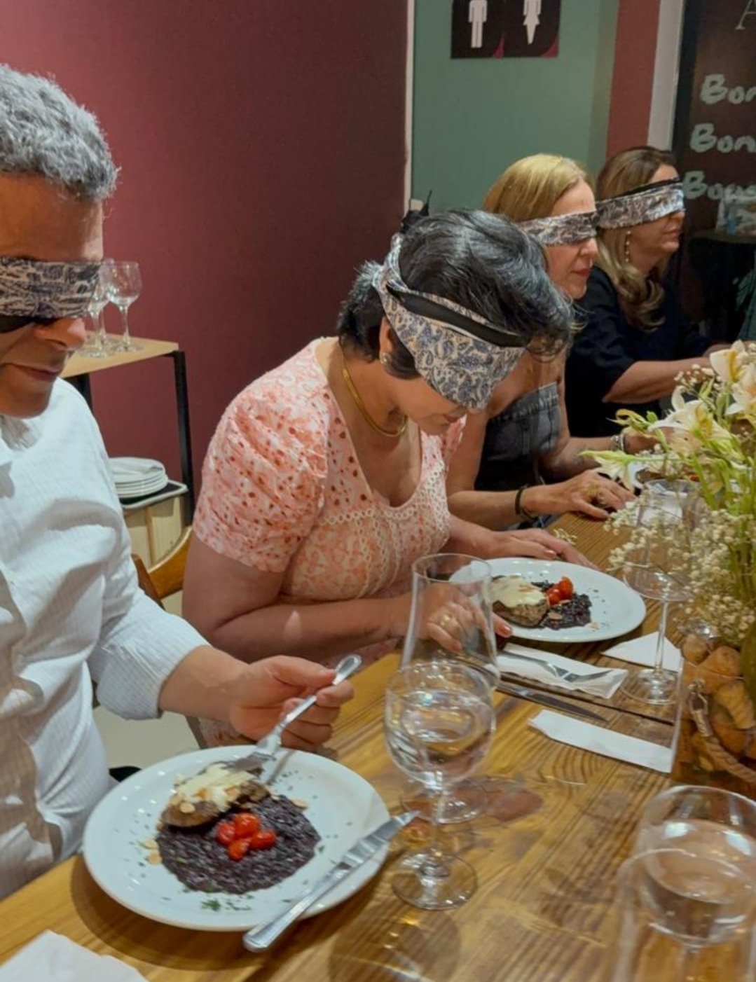 O evento foi um autêntico jantar às cegas, que desafiou os sentidos dos participantes a se guiarem unicamente pelo paladar e olfato, transformando a refeição em uma verdadeira experiência sensorial imersiva.