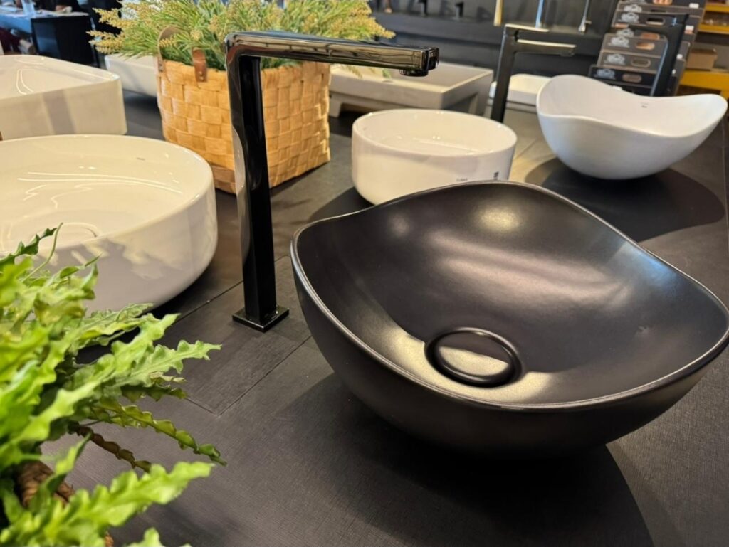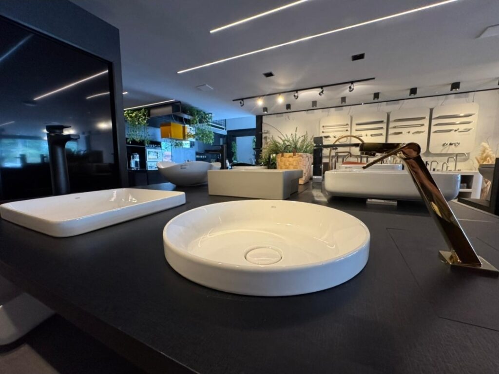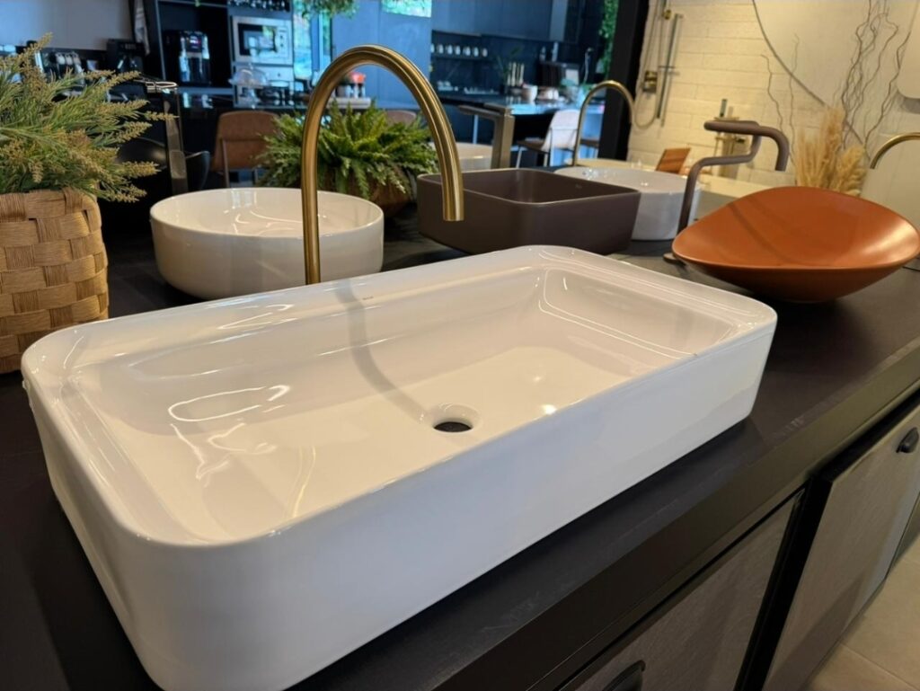 O modelo intermediário é a de sobrepor, que tem parte embutida na bancada e parte acima da bancada. “Esse último modelo tem agradado muito o público porque traz estética e a funcionalidade no mesmo produto, especialmente nos banheiros porque atende melhor a demanda de uso rotineiro”, explica ela.