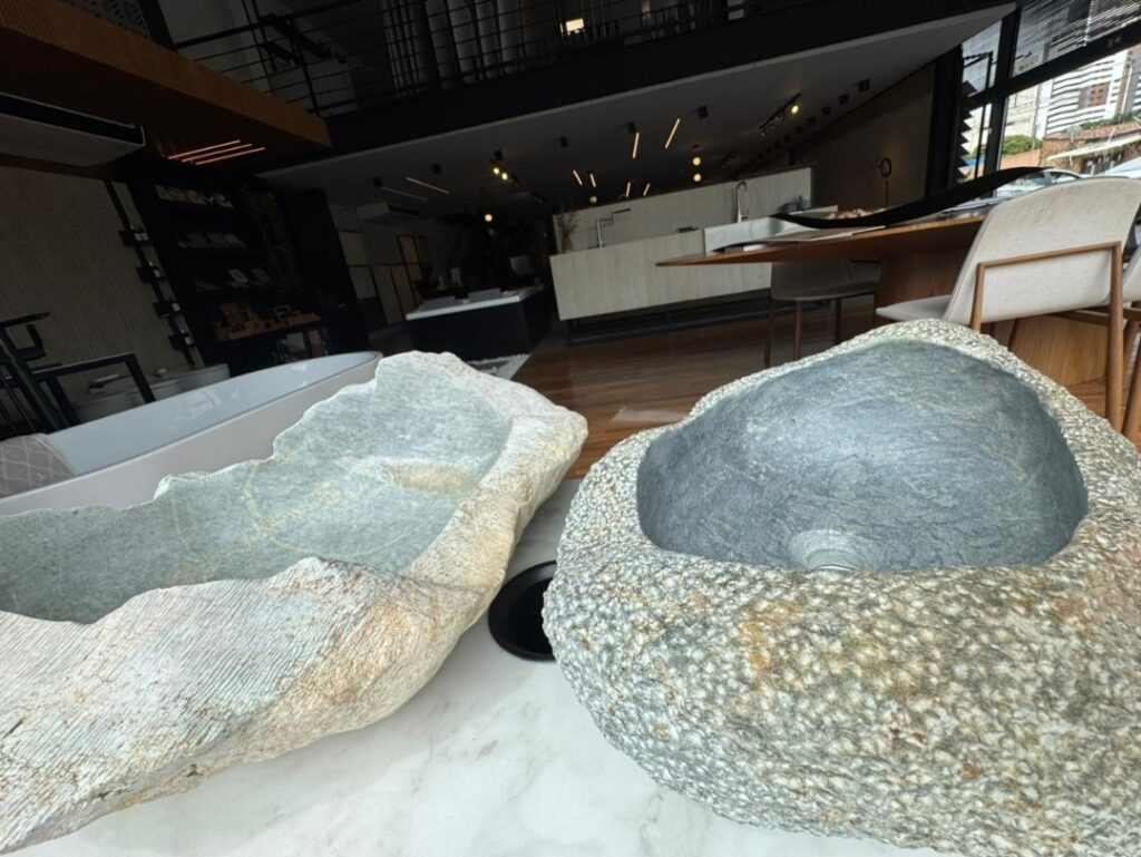 Para os amantes do rústico, as peças esculpidas em pedras naturais dão o tom e trazem charme ao ambiente. A Essence Acabamentos, por exemplo, oferece cubas esculpidas em pedras de produção única, exclusivas, esculpidas em pedras como a sabão ou quartzo.