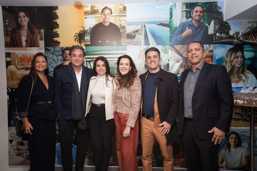 Aline Guedes, Head de Marketing do Grupo Flamboyant; Douglas Tolaine, diretor de design da Perkins&Will; Isadora Louza e Alessandra Louza, CEOs do Grupo Flamboyant, Henrique Cerqueira, superintendente da Flamboyant Urbanismo e Roger Caetano, Head Family Office.