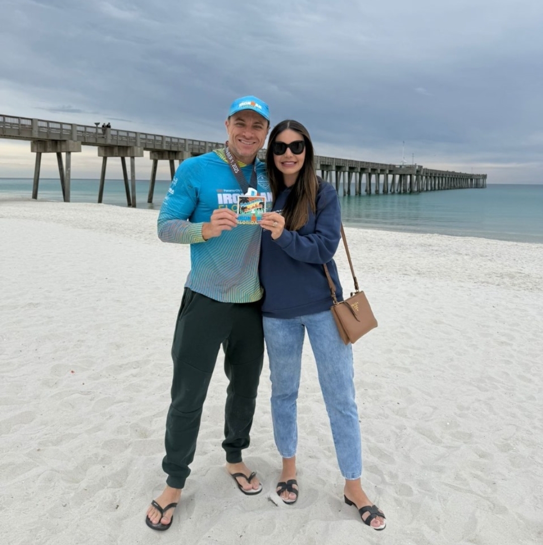 Depois de três meses de treinamento intenso e programado, o dentista Rogério Penna (na foto com a mulher, psicóloga Letícia Guedes, a grande incentivadora) concluiu com sucesso o Ironman Flórida, que teve início no dia 1º de novembro, na praia de Panama City Beach, na Flórida.