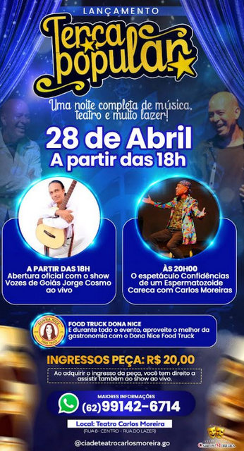 A Cia de Teatro Carlos Moreira lança na próxima terça-feira, dia 28 de abril, o projeto Terça Popular – Teatro e Cultura Goiana, nova iniciativa voltada à ocupação cultural do Teatro Carlos Moreira com uma programação acessível que reúne teatro, música ao vivo e gastronomia.