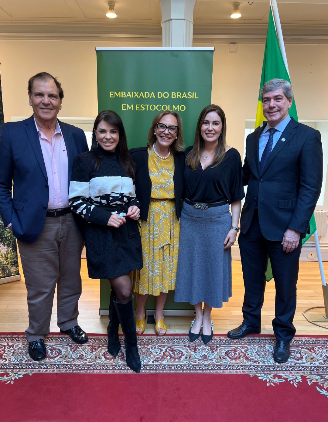 O presidente da Fieg André Rocha, acompanhado da esposa Priscila Rassi e do casal de empresários, proprietários da Manga Rosa Pink, Reginaldo Abdala e Silvinha Umbelino, encontram-se em Estocolmo, na Suécia, participando de uma missão empresarial. Durante a agenda, o grupo em visita a Embaixada Brasileira, foram cordialmente recebidos pela embaixadora Maria Edileusa Fontenele Reis.