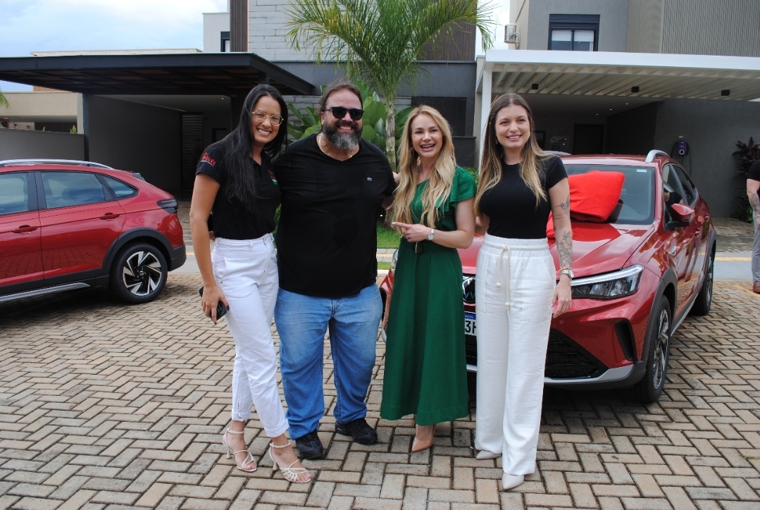 Feliz ganhador de um carro 0 km, durante a última festa de premiação realizada pela FGR Incorporações em 2025, o corretor de imóveis Marco Aurélio Milhomens recebeu da analista comercial Marília Santos (à esq.), da diretora comercial e de marketing da FGR, Camila Alcântara e da coordenadora de vendas da incorporadora, Bruna Prado, os parabéns pelo prêmio.