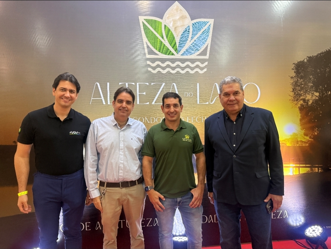 Thiago Cosac, da +VGV Imóveis, Celso Morais e Thiago Virgílio, da TVI Urbanismo e  Paulo Silas, da Sim Incorporadora, receberam os profissionais do mercado imobiliário no Passeio das Águas Shopping para apresentar um novo projeto para a região norte : o condomínio horizontal Alteza do Lago.