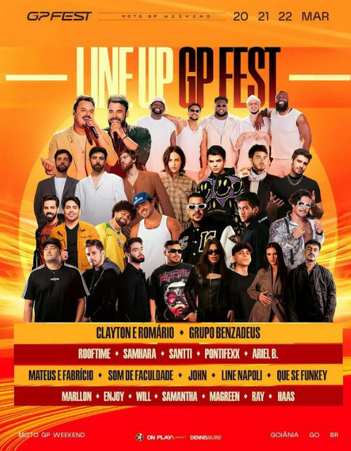 GP Fest movimenta a capital durante o fim de semana do MotoGP Brasil com quatro dias de programação musical, estrutura premium e local a ser anunciado em breve Rooftime, Clayton & Romário, Benzadeus e Samhara estão entre os principais nomes confirmados no GP Fest, festival que será realizado em Goiânia durante o fim de semana do MotoGP Brasil 2026 e que ainda reúne mais 15 atrações ao longo de quatro dias de programação. O evento integra o calendário paralelo à etapa brasileira do Mundial de Motovelocidade e amplia a agenda de entretenimento na capital goiana entre os dias 19 e 22 de março, com classificação para maiores de 18 anos. O local do festival será anunciado em breve pela organização.