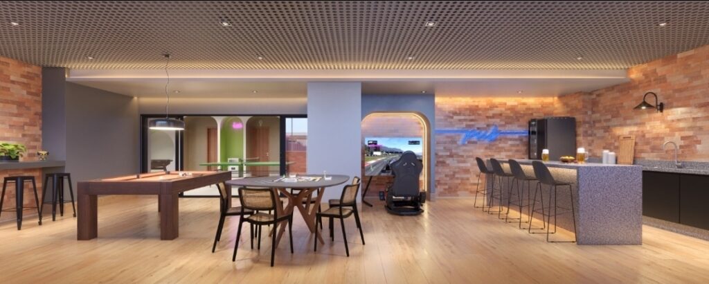 O Envolt Biophilic Home, empreendimento da Dinâmica Incorporadora, é mais um exemplo desse cenário – a empresa investiu em um ambiente com o foco num público jovem e adulto, com um espaço Pub com chopeira, mesa de bilhar e inédito cockpit para jogos.