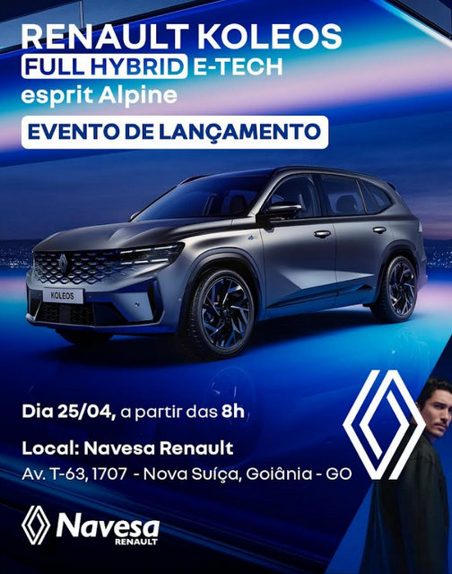O modelo chega em versão única, a “Esprit Alpine”, oferecendo um visual esportivo e acabamento refinado, com preços a partir de R$ 289.990. Sua motorização “E-Tech Full Hybrid” de 1.5 turbo, com dois motores elétricos, inclui painel digital triplo, central multimídia avançada, câmeras 360º, teto panorâmico e um pacote completo de assistências de direção (ACC, frenagem autônoma, etc.). Os primeiros compradores terão acesso a condições especiais de lançamento, oferecidas pelo diretor José Tarcísio Júnior.  Mais informações e agendamento de test drive em @renaultnavesa e no (62) 3235-8888Sobre o novo Renault Koleos 2026 .