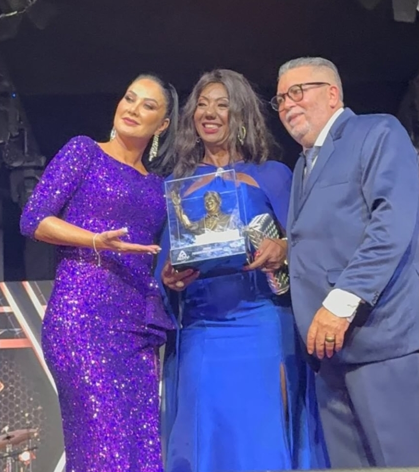 No palco do Troféu Maguito Vilela 2025, a empresária Eliana Turchetti recebeu o troféu das mãos da apresentadora Helen Ganzarolli e do idealizador e jornalista Leno Silva, da Alô TV.