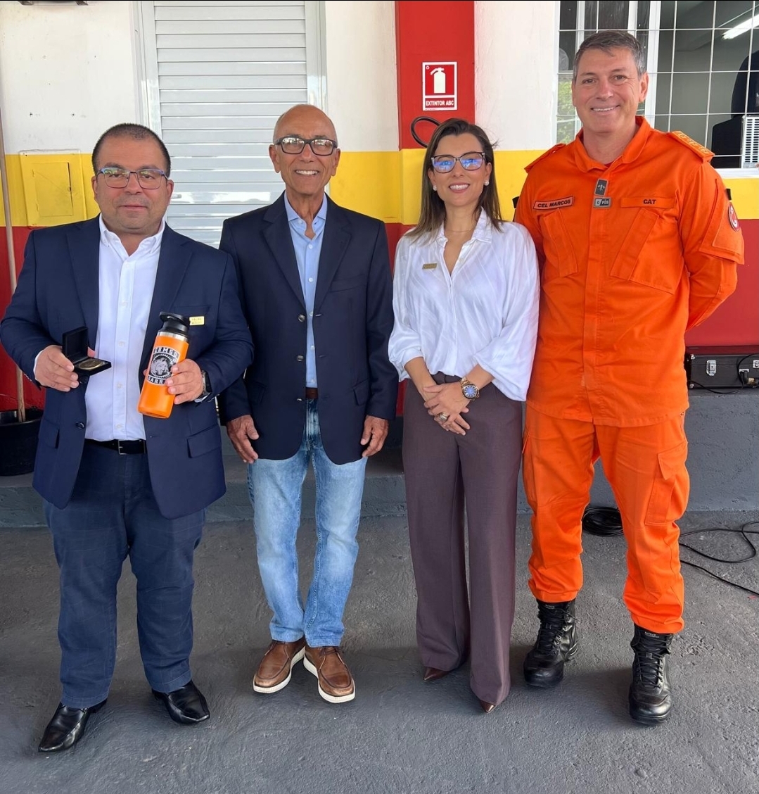 Na foto, o presidente do Instituto Consciente, Felipe Inácio, a diretora de empreendimentos da Consciente, Camila Inácio, o presidente da incorporadora, Ilézio Inácio, e o comandante do Comando de Atividades Técnicas do Corpo de Bombeiros, Coronel Marcos.