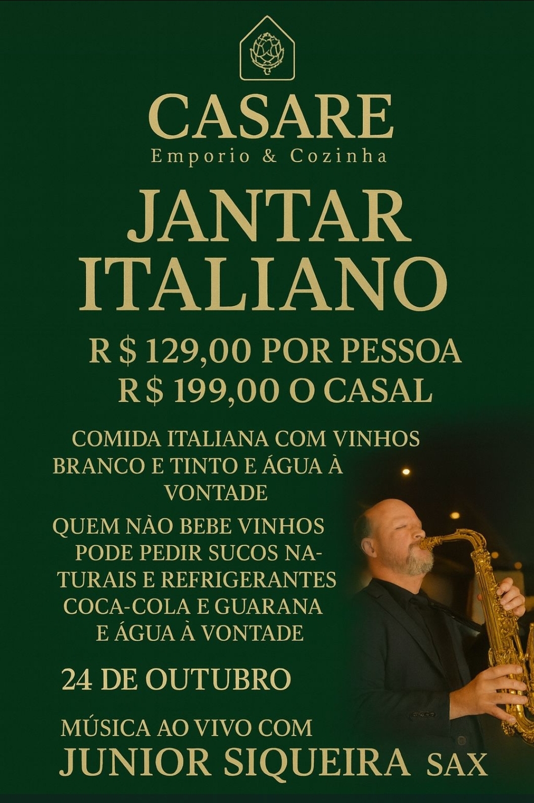 🍝 Comida italiana à vontade 🍷 Vinhos branco e tinto inclusos 🥤 Para quem não bebe vinhos: sucos naturais, refrigerantes (Coca-Cola e Guaraná) e água à vontade 🎷 Música ao vivo com Junior Siqueira – Sax