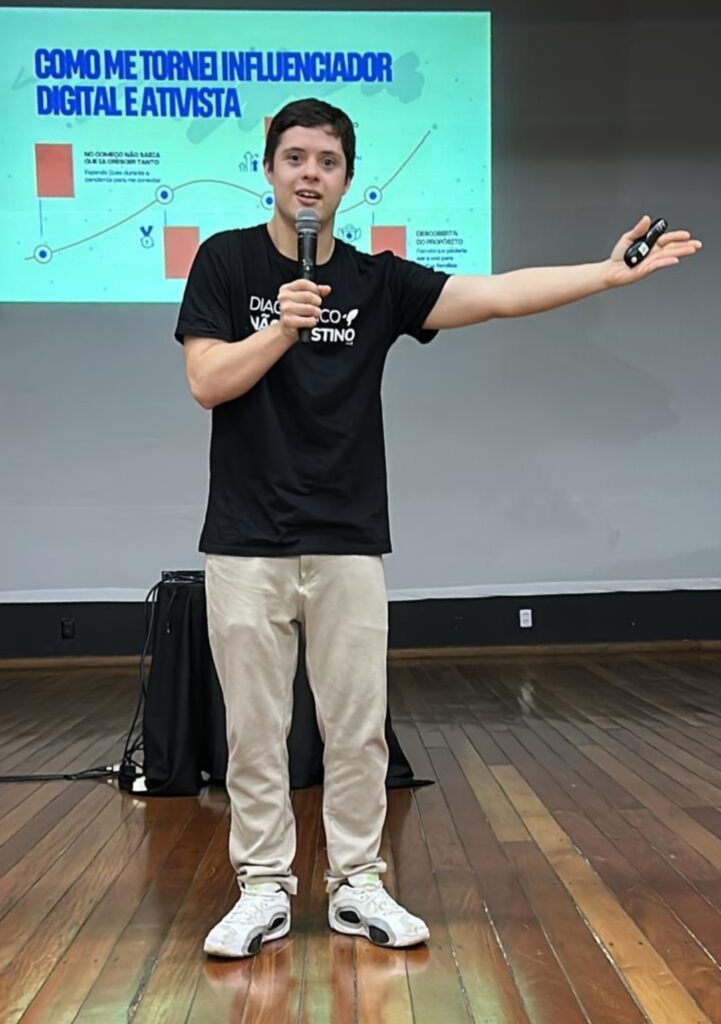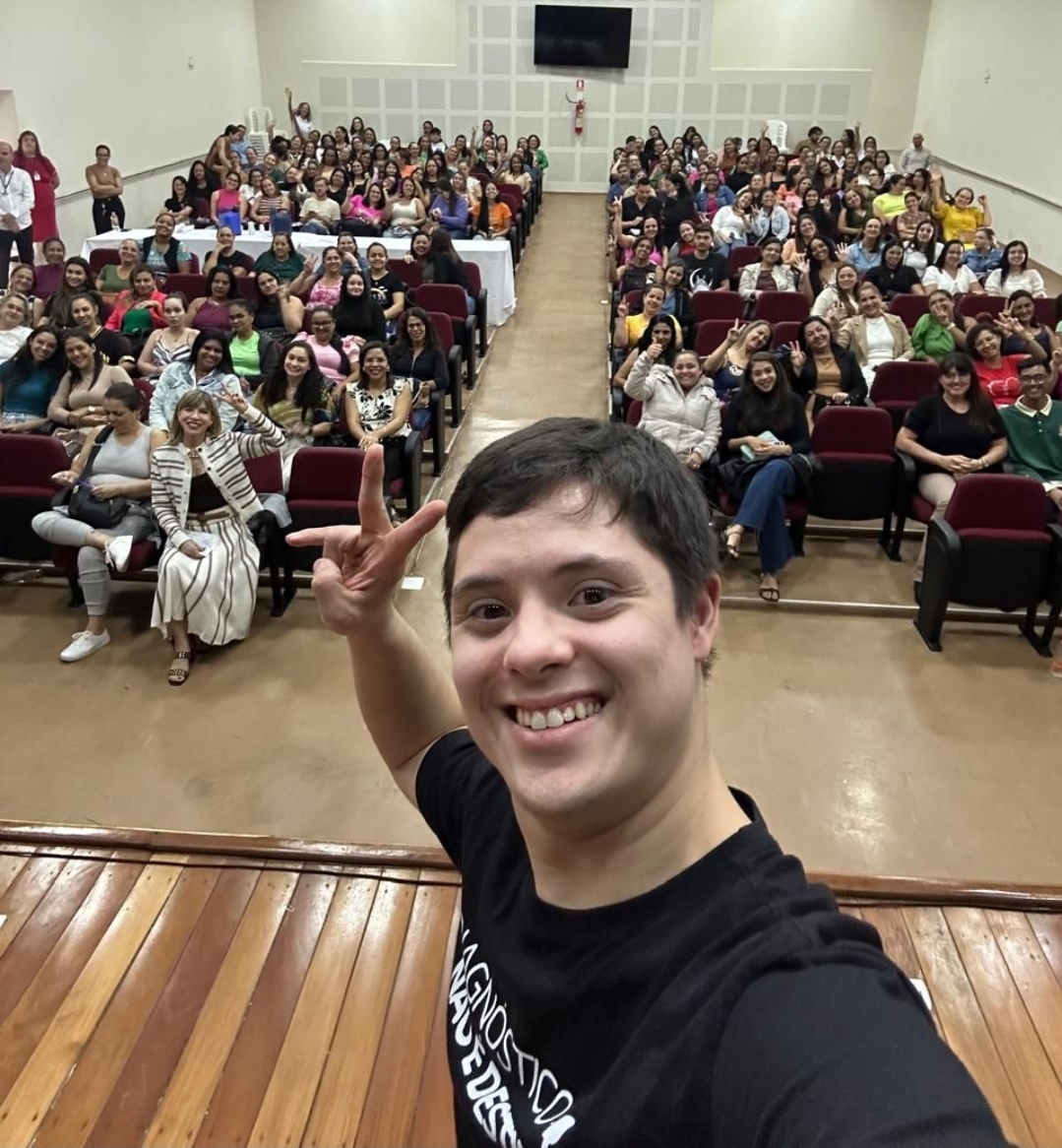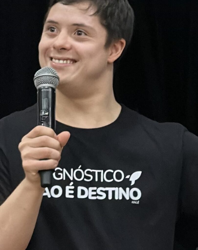 Durante a apresentação, João Vitor. primeiro aluno com síndrome de Down formado em Educação Física pela PUC Goiás e primeiro Jovem Ativista do UNICEF com T21 no Brasil, falou sobre a importância da inclusão, da autonomia e da quebra de estigmas que ainda cercam as pessoas com deficiência.