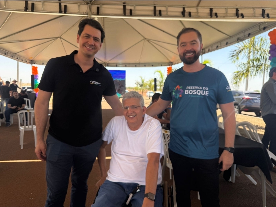 O especialista em mercado imobiliário e CEO da +VGV Brasil, Thiago Cosac (à esq.), e o diretor da Localiza Urbanismo, Danilo Tavares (à dir.), receberam o prefeito de Abadia de Goiás, Wander Saraiva (ao centro), no lançamento da última etapa do bairro planejado Reserva do Bosque, na cidade, no último sábado (4 de outubro). Com 350 lotes, a etapa está localizada no entorno do Parque do Lago, uma área de lazer de 88 mil m², que traz como destaque um lago de 22 mil m².