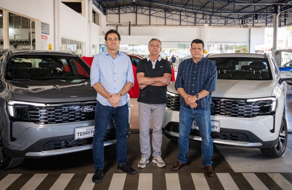 Os diretores Edgar Queiroz, Mario Henrique Queiroz e Tarciso Cardoso lançarão o novo Ford Territory 2026, em Goiânia, na noite de quarta, 23 de Julho.