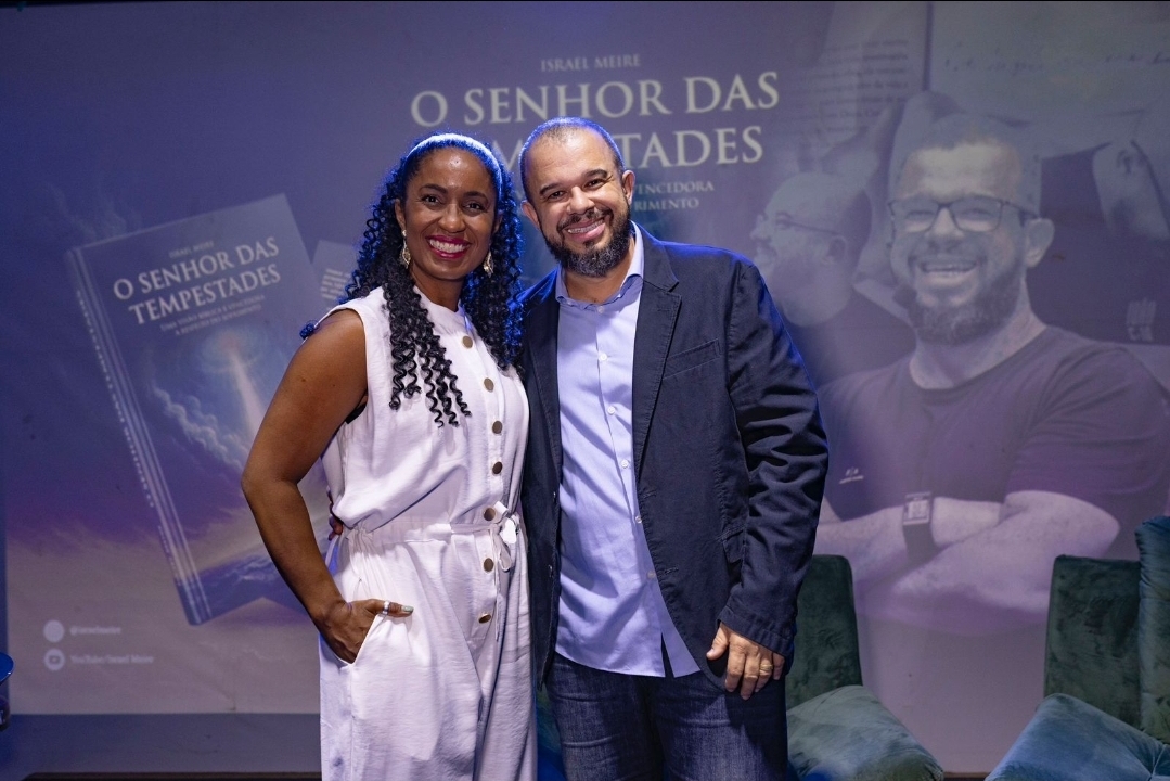 Escritor, teólogo e pastor Israel Meire, ao lado da esposa, Raquel Máximo, no lançamento de seu livro O Senhor das Tempestades (Editora Kelps), obra que aponta caminhos para lidar com o sofrimento humano.