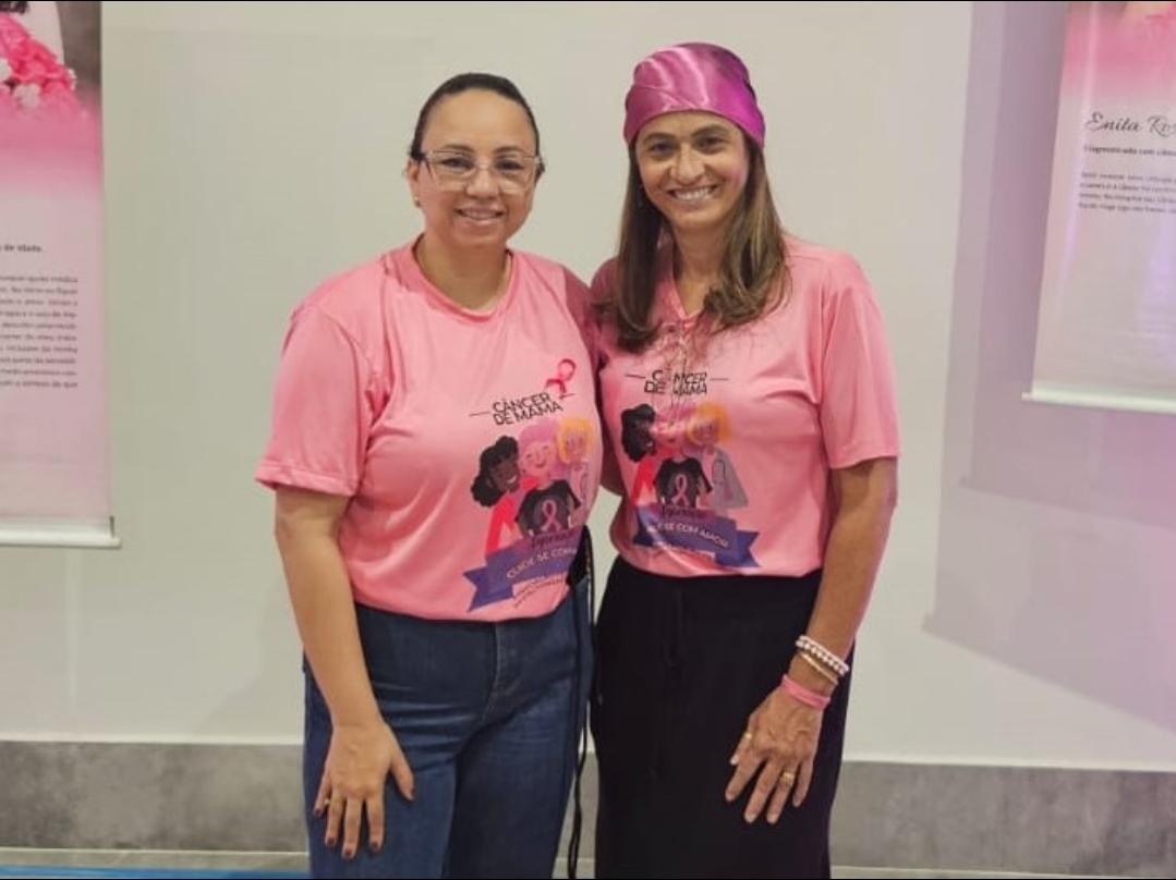 A gerente do hotel Ibis Styles Goiânia do Shopping Estação, Marília Oliveira (à esq.), e a vice-presidente da Associação de Mulheres Mastectomizadas de Goiás (AMMAG), Maionara Xavier da Silva (à dir.), durante ação de Outubro Rosa realizada no último sábado (11 de outubro).