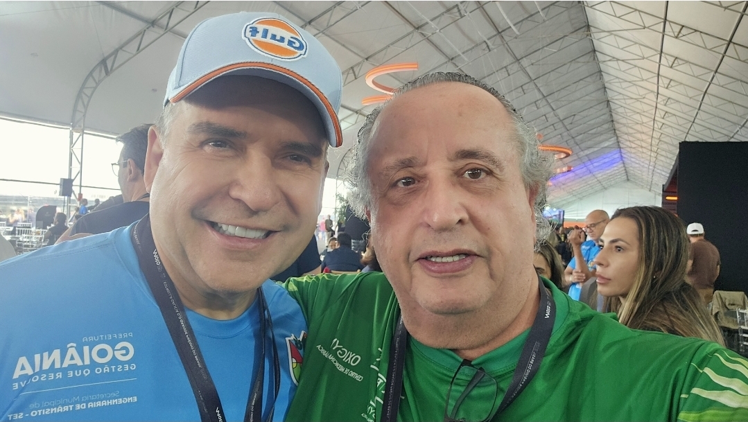 O prefeito de Goiânia, Sandro Mabel, ao lado do produtor de eventos Elpídio Fiorda Neto, marcaram presença no lounge da Kallas Mídia OOH, no Grid Club, durante o MotoGP Grande Prêmio de Goiânia.