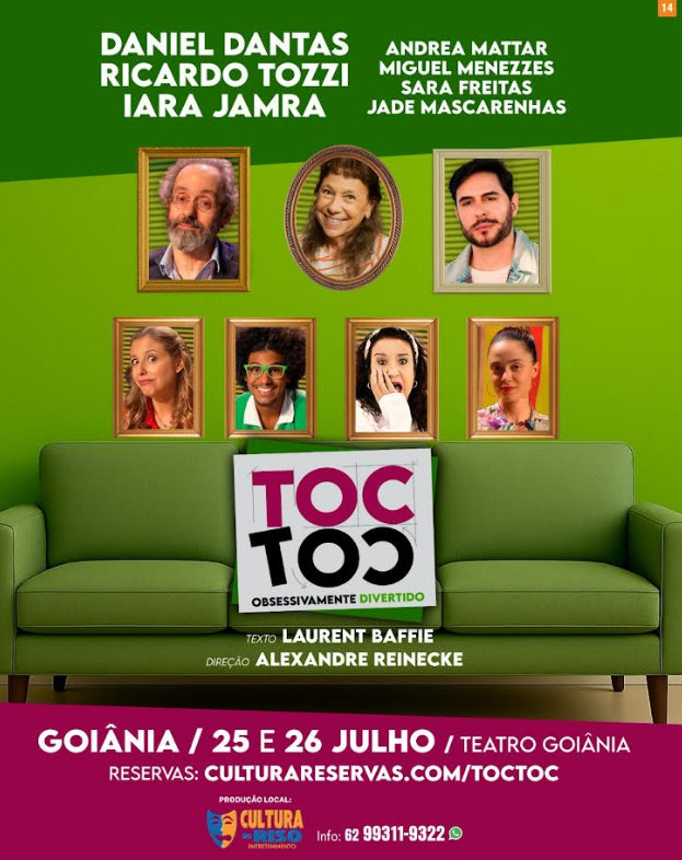 Fenômeno de público em diversas montagens ao redor do mundo, o espetáculo “TOC TOC – Obsessivamente Divertido” desembarca em Goiânia nos dias 25 e 26 de julho, no Teatro Goiânia. A comédia, escrita pelo dramaturgo francês Laurent Baffie e adaptada e dirigida por Alexandre Reinecke, aposta em humor inteligente para abordar o Transtorno Obsessivo Compulsivo (TOC) de forma leve e acessível.