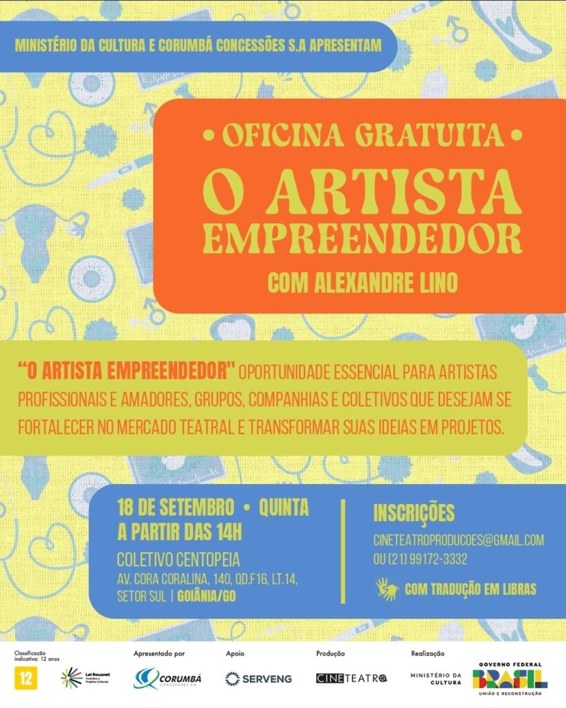 Com início às 14h, no Coletivo Centopeia, a atividade integra a programação do espetáculo “Minha Nova Ginecologista”, que será apresentado no Teatro Goiânia às 20h do mesmo dia.