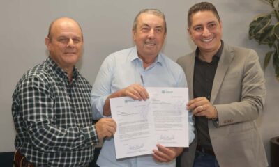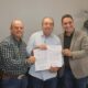 Presidente do Sindicato Rural de Itapirapuã, Edgard Scatena Filho, Presidente do Sistema FAEG, José Mário Schreiner e prefeito Cássio Roberto. Encontro em Goiânia fortalece diálogo entre...