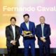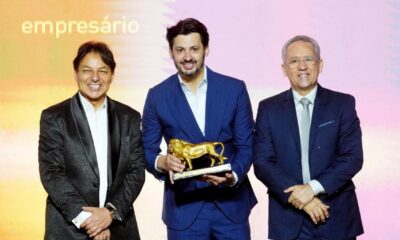 Fernando Cavalcanti (centro), com os anfitriões da noite Marcelo Mesquita, sócio presidente, (direita) e Carlos Roberto Soares, Sócio diretor da Área Internacional (esquerda), entregando o prêmio...