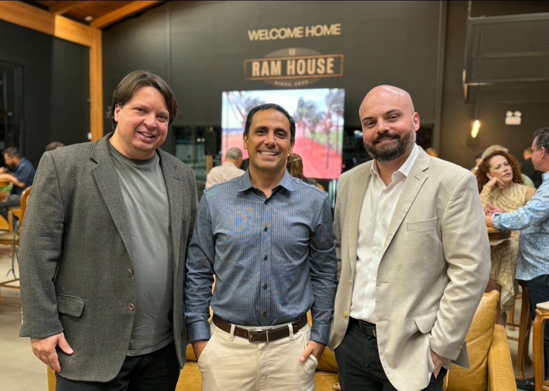 O sommelier da My Winery, Alberto Nascimento, com Leandro Daher, sócio-diretor da Raiz Urbana, empresa do Grupo Tropical, e Victor Hugo Itabaiana, no evento avant premiére de apresentação do novo Aldeia do Vale, em Pirenópolis, realizado na Ram House.