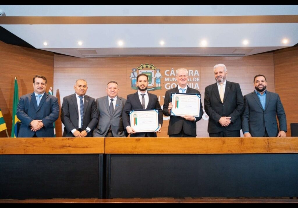Na foto, os homenageados e os vereadores, e os presidentes da OCB Goiás, Luís Alberto Pereira e Central Sicredi Brasil Central (BRC), Celso Figueira.