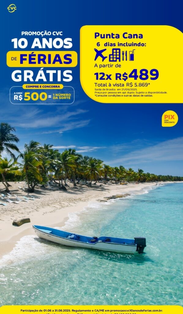 Para quem deseja viver tudo isso, a CVC Viagens Goiás está com uma promoção especial: pacotes de 6 dias em Punta Cana a partir de 12x de R$ 489 por pessoa, com saída de Brasília no dia 21 de setembro de 2025.
