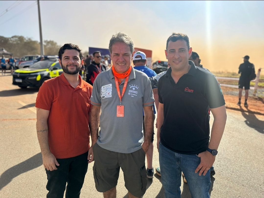 João Marcos Lacerda, coordenador de marketing da FGR Incorporações (à esquerda) e Gustavo Araújo, coordenador de obras da FGR Incorporações (à direita), recepcionando o diretor técnico do Rally dos Sertões, Edgar Fapre, nas terras do Jardins Grécia, em Senador Canedo, onde foi realizada uma das primeiras etapas do esporte automobilístico de 2025.