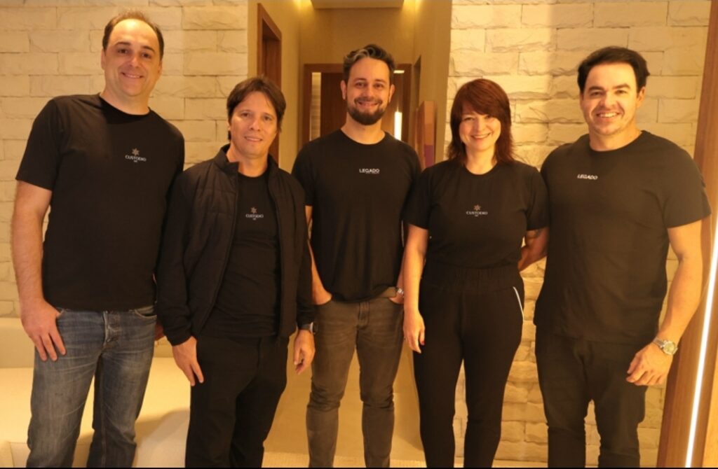 Giovanni Mati (sócio diretor jurídico da Custódio Inc), Caubi Pinheiro (sócio diretor comercial da Custódio Inc), Bráulio de Paula (sócio da Legado Inc), Iara Luiza Dawa (sócia diretora de projetos e MKT da Custódio Inc) e Ronaldo Dantas (CEO da My Broker), na apresentação do Biografia Parque Flamboyant.
