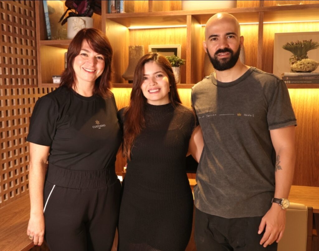 A diretora de projetos e MKT da Custódio Incorporadora, Iara Luiza Dawa com os arquitetos Mayana Pinheiro e Felipe Rosa.