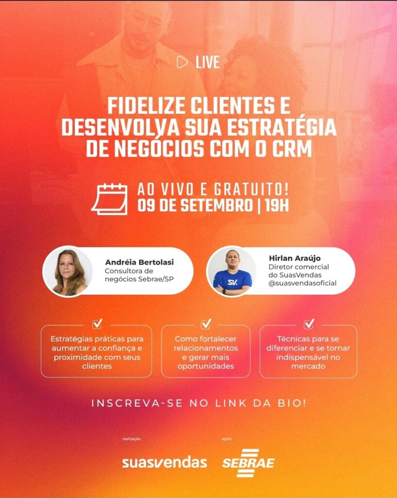 A live contará com a participação de Hirlan Araújo, diretor comercial da SuasVendas, e Andréia Bertolasi, consultora de negócios do Sebrae, que irão compartilhar dicas práticas e estratégias eficientes para melhorar o relacionamento com o público-alvo, fortalecer a confiança dos clientes e ampliar as oportunidades de crescimento no mercado.