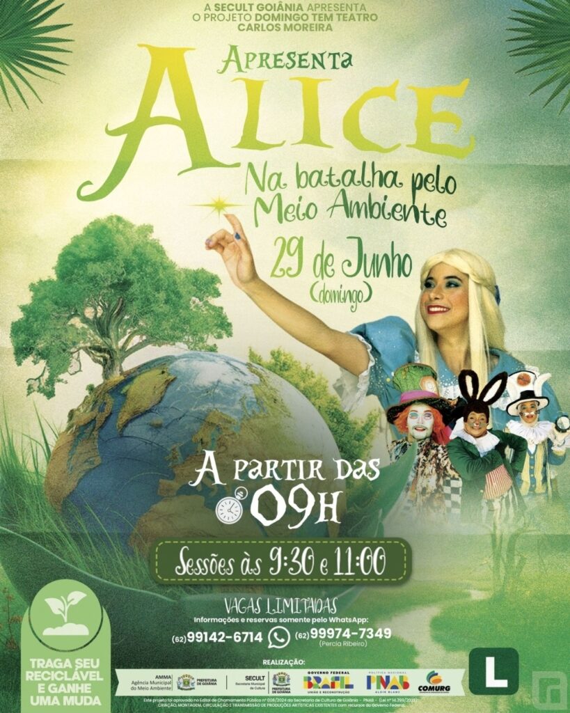 A organização recomenda a reserva prévia pelos números (62) 99974-7349 ou (62) 99142-6714, pois os lugares estão sujeitos à lotação“Alice na Batalha pelo Meio Ambiente”, um espetáculo envolvente que traz ensinamentos valiosos sobre preservação ambiental, será apresentado em duas sessões, às 9h30 e às 11h, com ingressos a preço popular de R$ 10,00.