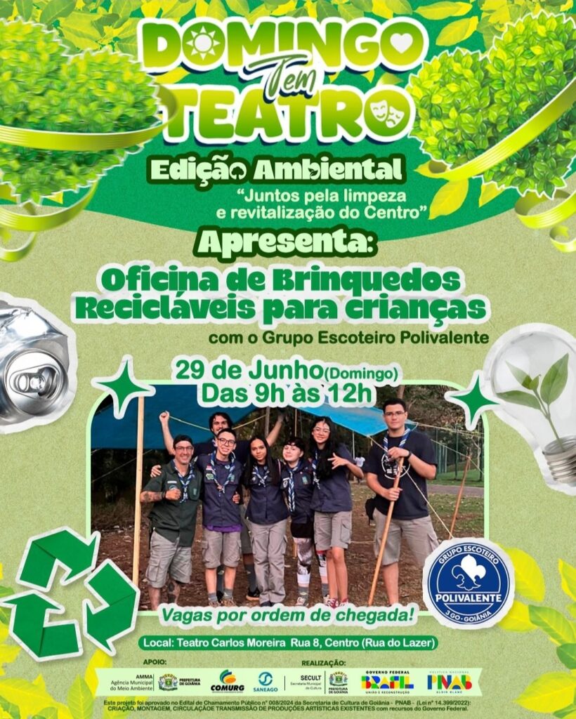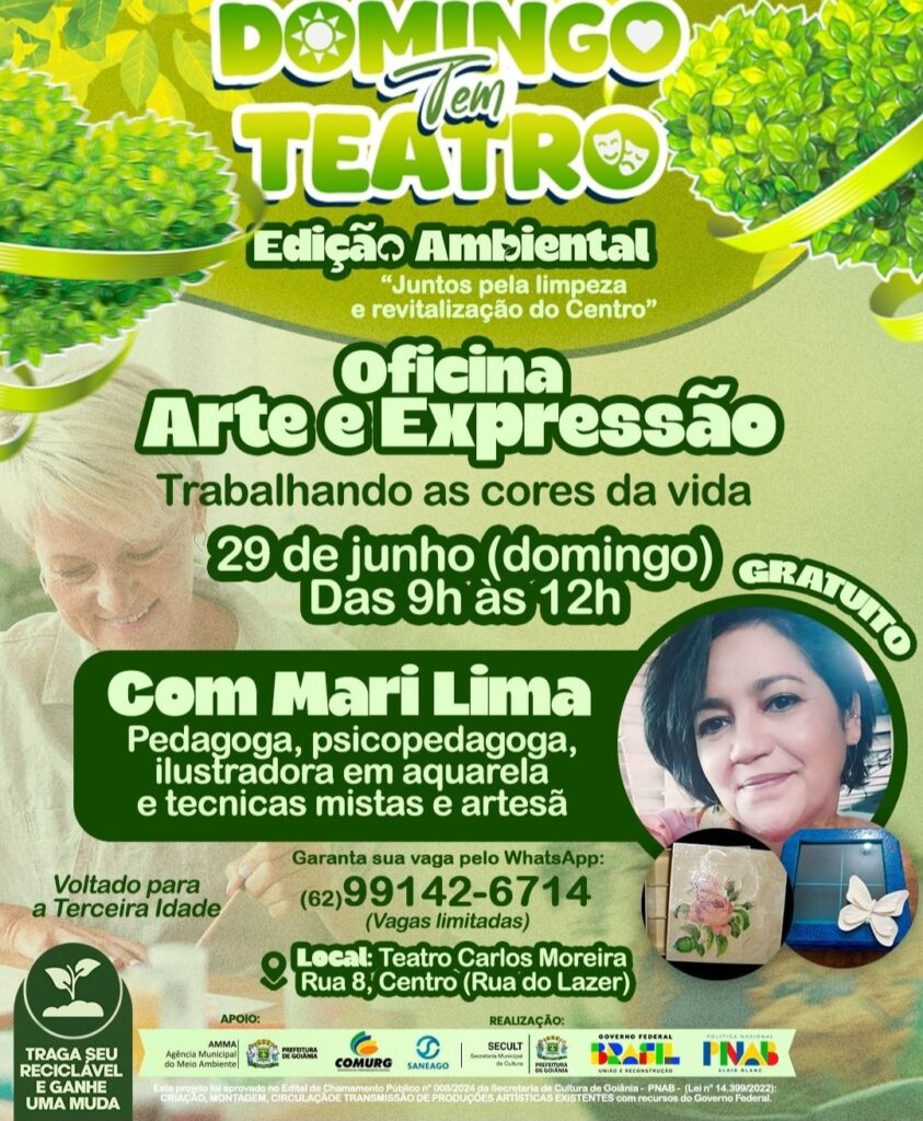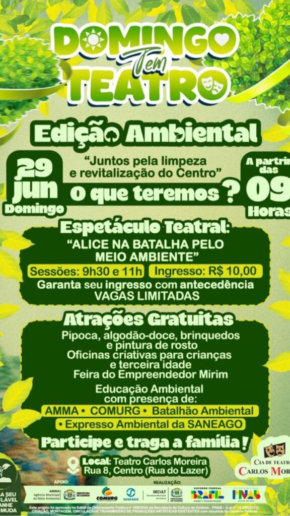 Cia de Teatro Carlos Moreira e Secult Goiânia promovem edição especial do projeto Domingo Tem Teatro neste domingo (29), das 9h às 12h, com apoio da AMMA, Comurg, Batalhão Ambiental e Saneago.