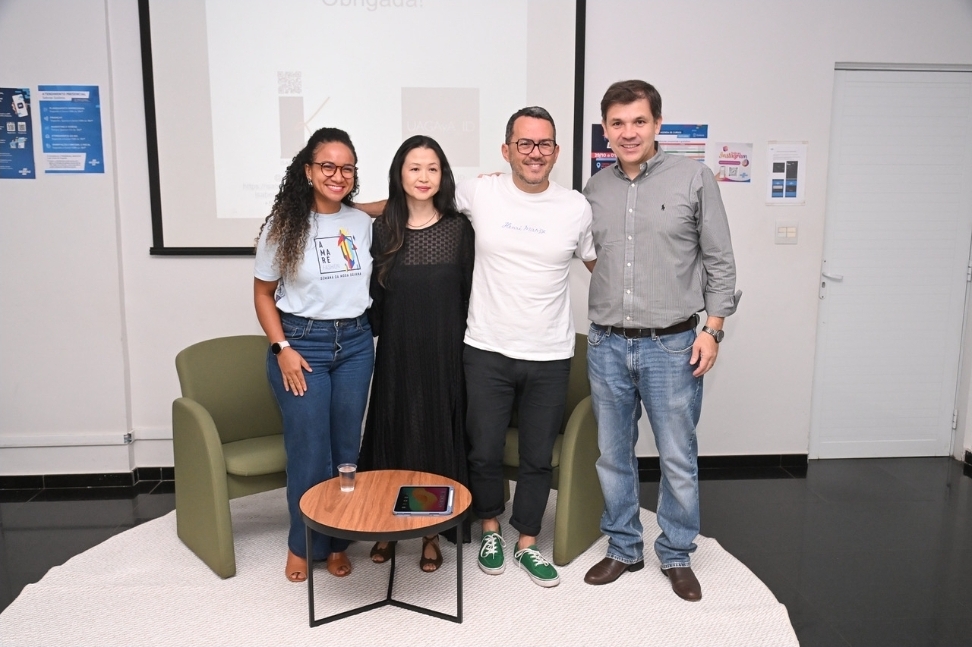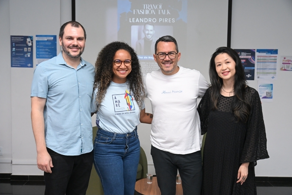Leonardo Araújo, Gestor de Internacionalização do Sebrae Goiás, Thaís Oliveira, gestora estadual de moda do Sebrae, Leandro Pires, empresário e especialista em negócios de moda e projetos culturais, e Isabela Keiko, representante exclusiva no Brasil dos salões Tranoï, durante Tronaï Fashion Talk. (crédito Silvio Simões).
